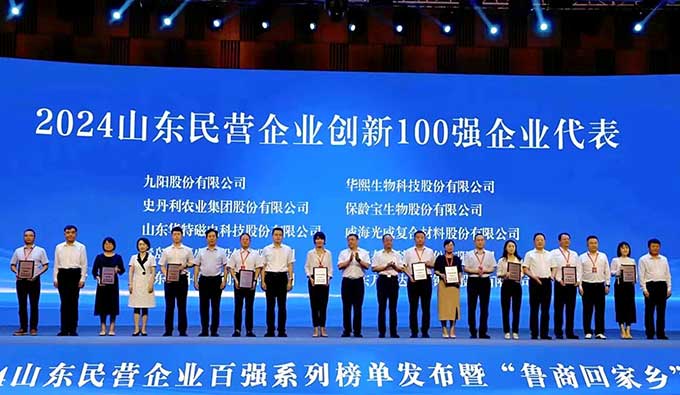 7月26日,2024年山東民營企業百強系列榜單發布暨“魯商回家鄉”活動在濱州市博興縣舉行。會上,發布了“2024年山東民企200強”“創新100強”“吸納就業100強”等榜單。金城醫藥集團繼2022年、2023年獲評后再度榮獲山東民營企業創新100強榮譽。